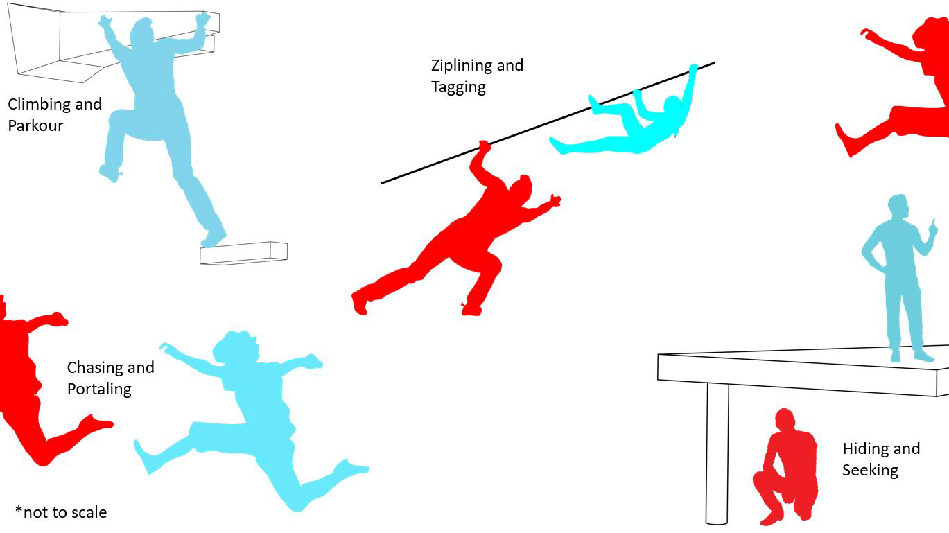 Actions such as Climbing, Parkour, Hiding, Ziplining, and Running through portals allows for different scenarios to create diverse scenarios of the game.